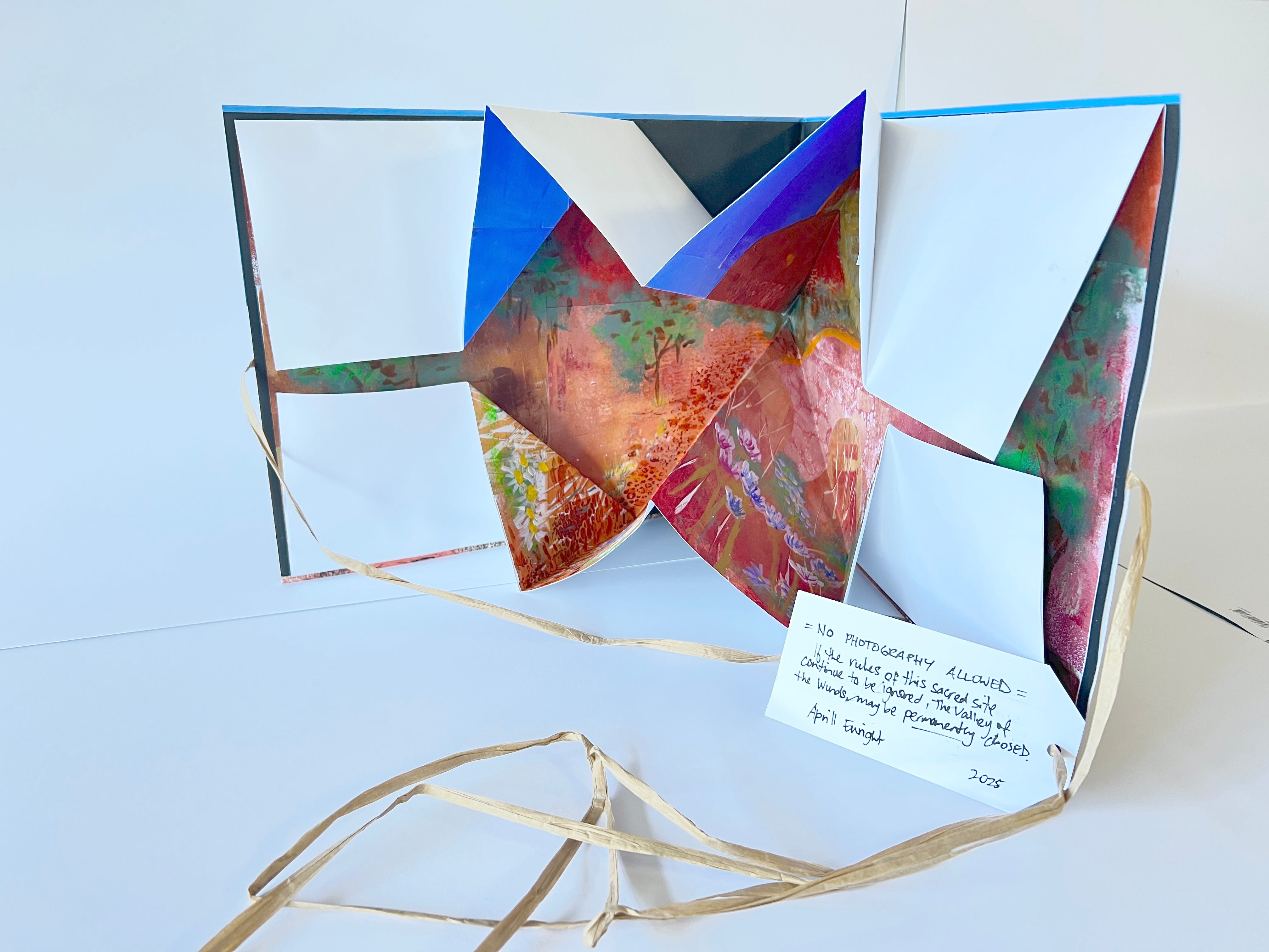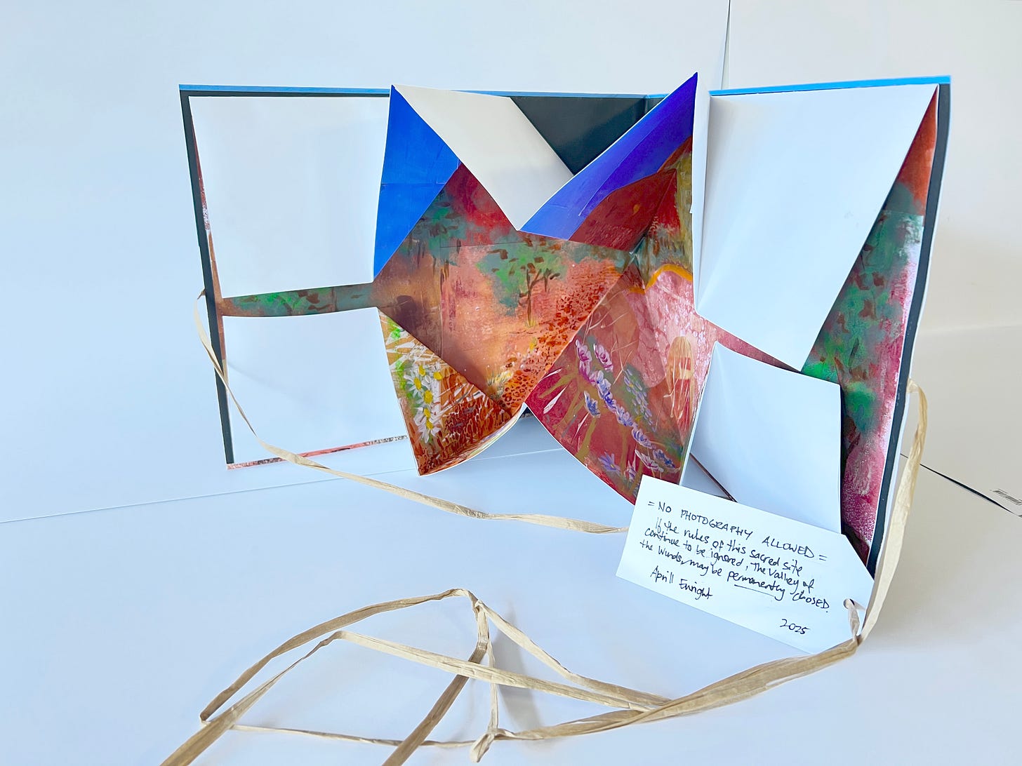 This work explores what it means to step off the grid—beyond what can be recorded or accurately reproduced. During a walk through the sacred site of Kata Tjuṯa’s Valley of the Winds, photography of the rock formations was forbidden. That restriction heightened my awareness; memory became my only map. The concertina book pairs my exterior photograph of Kata Tjuṯa with hand painting, and gel prints of the interior, recalling impressions, reflecting on sanctity, memory, and what we may lose sight of altogether if the camera roll doesn’t stay closed.