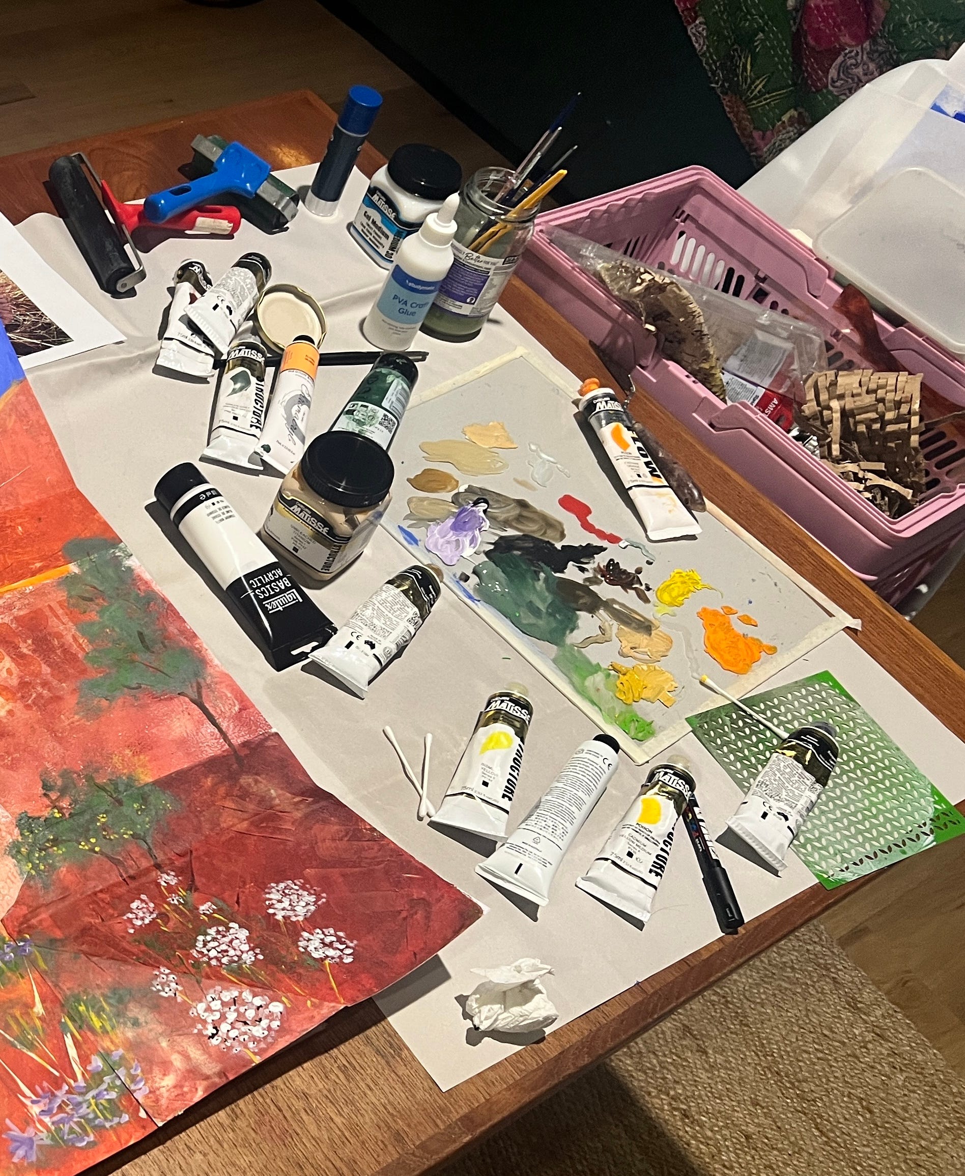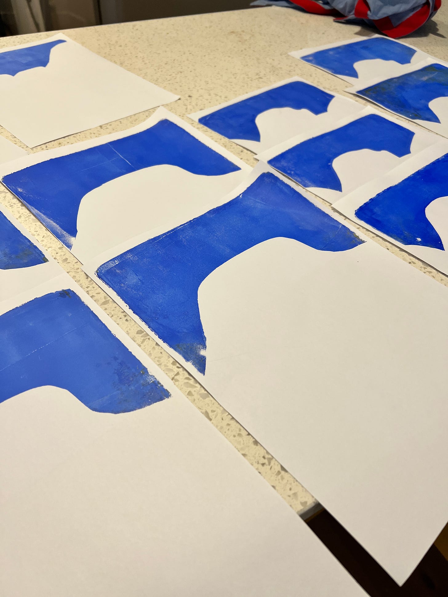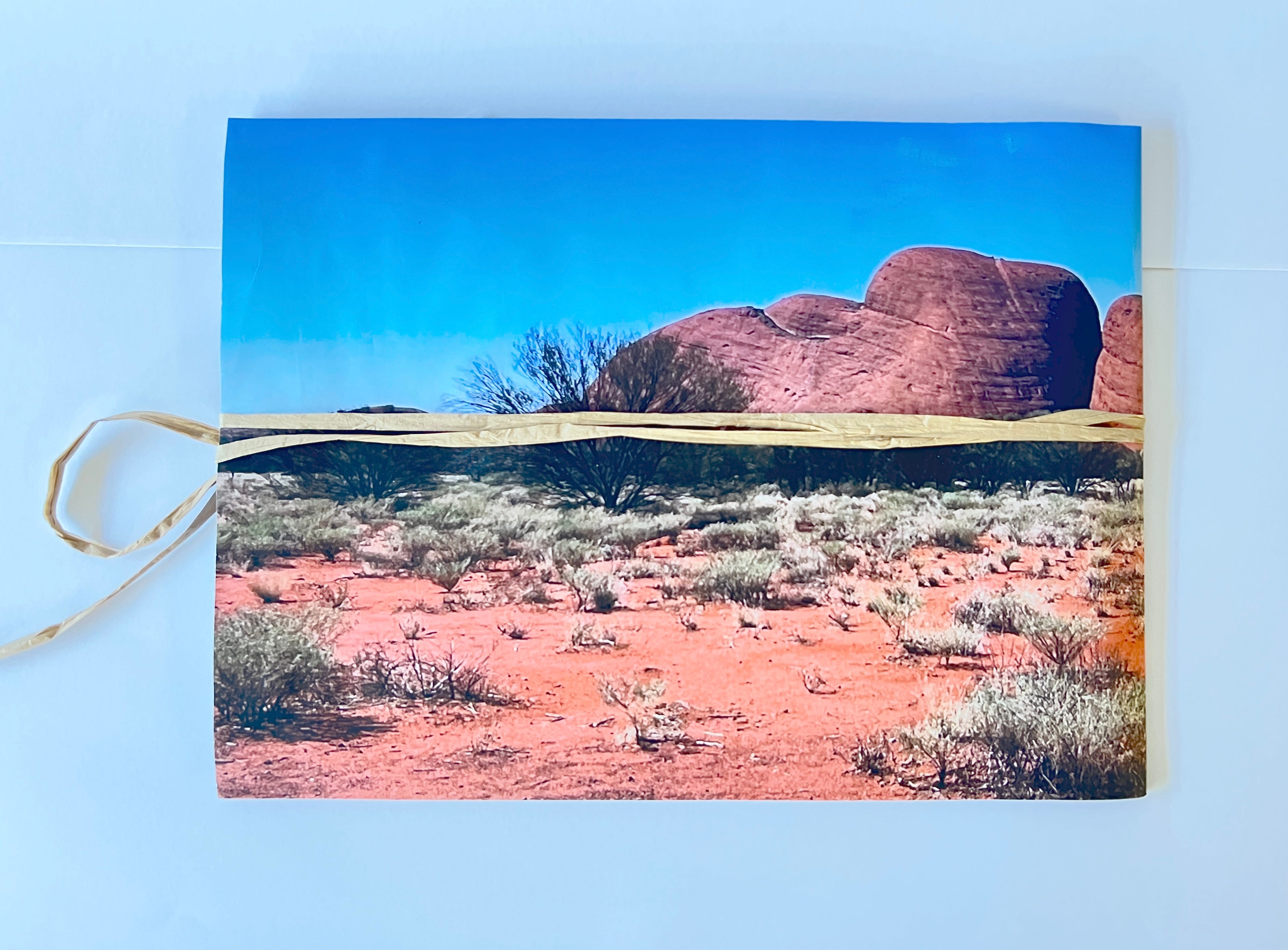 Given we’d just completed a unit of class work that involved creating concertina books from all the prints we’d produced in the previous unit, I decided to revisit the gel printing to make a larger-scale concertina book. As the idea took more shape, I decided I wanted to make a book cover from the only photo I had of the Olgas—the one I’d taken from the designated area outside the perimeter.