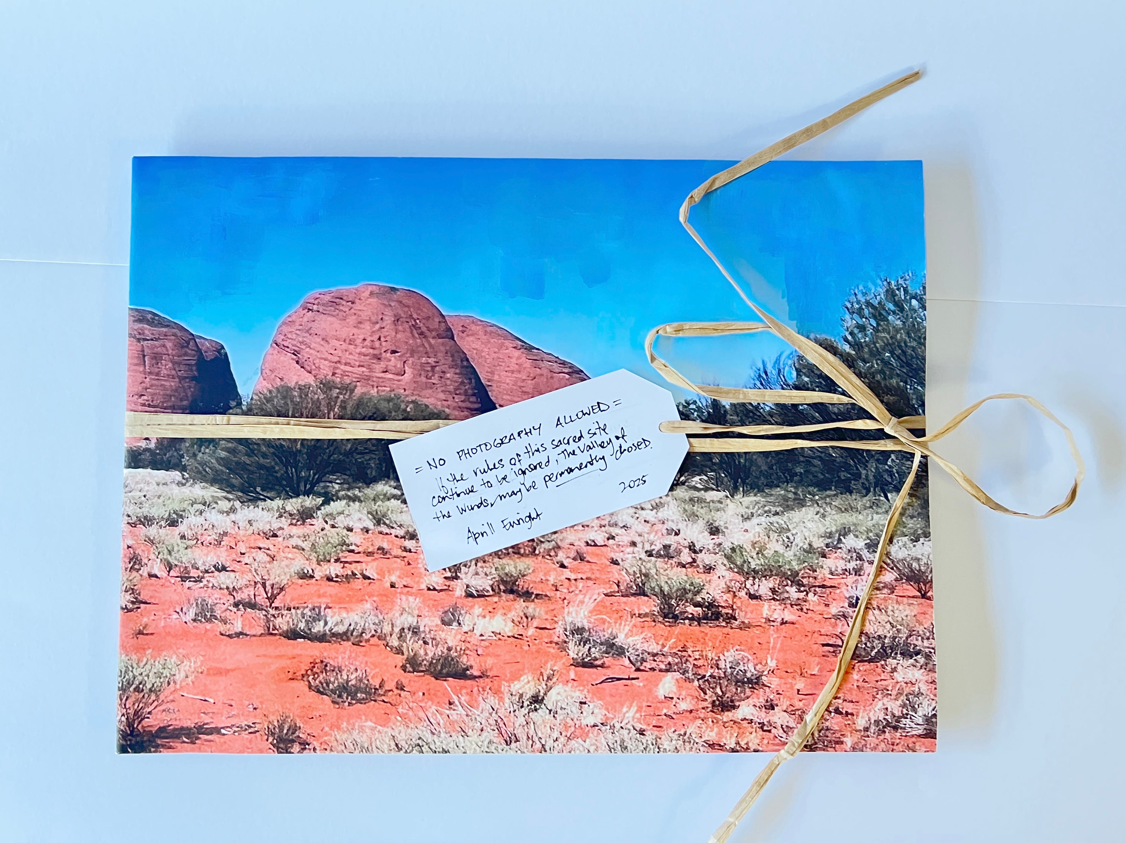In August, I spent a few days at Uluru. One of the guided walks I went on was through the Valley of the Winds at Kata Tjuṯa (aka the Olgas). The walking trail is part of a sacred site belonging to the Anangu people. Apart from being “off the grid”, in terms of there being no mobile reception, there are signs along the trail reminding visitors of the cultural sensitivities of the site, and that they must not take photographs of the rock formations from the interior.
